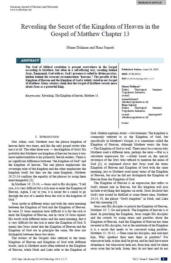Biblical Studies about the Kingdom of Heaven based on the Gospel of Mattew and Its Implication at Borneo Evangelical Mission (BEM) Miri Sarawak Church , European Journal of Theology and Philosophy: Vol. 5 No. 1 (2025) -